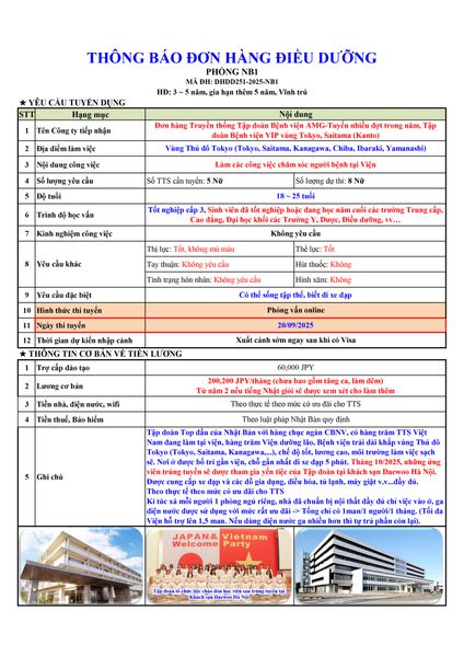 ĐƠN HÀNG MỚI CẦN 8 NỮ ĐIỀU DƯỠNG thi tuyển ngày 20/09/2025